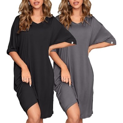 2-Pack Women's Nightgowns Short Sleeve Nightshirt V Neck Soft Sleepwear Casual Sleepshirts Loose Pajama Dress