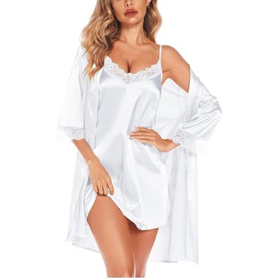 Women's Satin Robe Set 2 Piece Sexy Pajamas Sets Lace Cami Nightgown and Silk Robes Nightwear