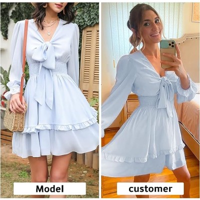 EXLURA Women Tie Front Elastic Waist Tiered Ruffle Layer Floral Balloon Long Sleeve V-Neck A-Line Mini Dress