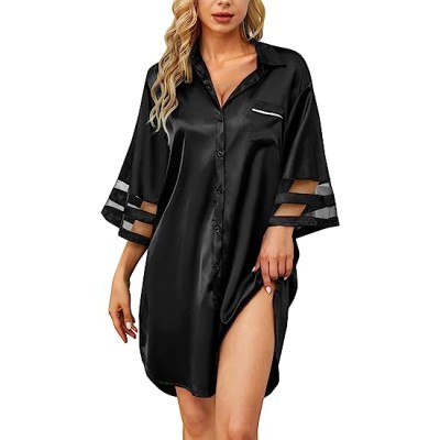 Women's Satin Nightgown Button Down 3/4 Sleeve Sleepwear Silk Night Gowns Nightshirt with Pocket