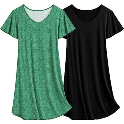 2 Pack Nightgowns for Women Flare Short Sleeve Sleepshirt V Neck Sleepwear Plain/Floral Print Pajama Dress